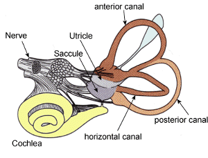 The vestibular system, which contributes to our balance and our sense of spatial orientation, is the sensory system that provides the dominant input about movement and equilibrioception. Together with the cochlea, a part of the auditory system, it constitutes the labyrinth of the inner ear, situated in the vestibulum in the inner ear (Figure 1). As our movements consist of rotations and translations, the vestibular system comprises two components: the semicircular canal system, which indicate rotational movements; and the otoliths, which indicate linear accelerations. The vestibular system sends signals primarily to the neural structures that control our eye movements, and to the muscles that keep us upright. The projections to the former provide the anatomical basis of the vestibulo-ocular reflex, which is required for clear vision; and the projections to the muscles that control our posture are necessary to keep us upright.